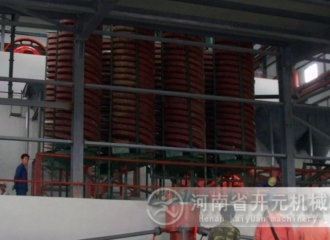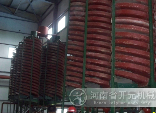 將螺旋溜槽通過螺旋支架立起,校準垂直線,用鐵架固定在合適的位置,由砂泵將礦砂送到螺旋上頂兩個進料口處,加入補充水,調節礦槳濃度,礦槳自然從高往下旋流,在旋轉的斜面流速中產生一種慣性的離心力,以礦砂的比重、粒度、形狀上的差異,通過旋流的重力和離心力的作用,將礦與砂分開,精礦流入精礦斗用管道接出,尾砂流進尾砂斗用管道接到砂池,再用砂泵排走,完成了選礦的全過程