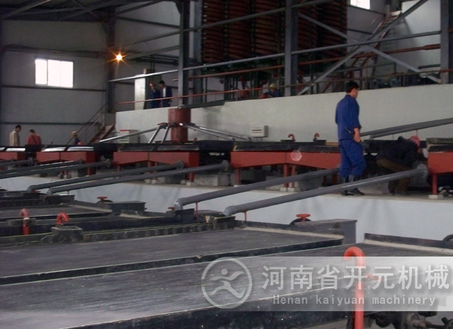 6S搖床選礦過程是在具有來復條的傾斜臺面上進行的,礦粒群從臺面上角的給礦槽送入,同時由給水槽供給橫向沖洗水,在振動波作用下,按比重和粒度分層,并沿臺面作縱向運動和橫向運動.比重和粒度不同的礦粒沿著各自的運動方向呈梯形流下,分別從精礦端和尾礦側的不同位置排出,*后被分成精礦、中礦和尾礦。