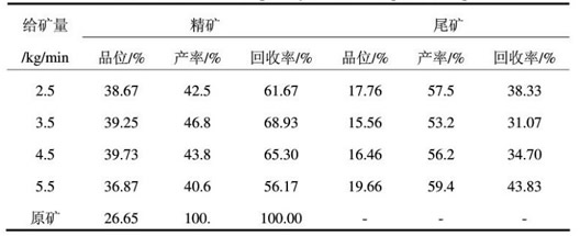單位時間內(nèi)的給礦量對磁選設(shè)備分選效果的影響也較大。給礦量過大會使轉(zhuǎn)環(huán)的負荷較大,同時容易造成介質(zhì)堵塞,增加夾帶情況的發(fā)生和目的礦物的損失;給礦量過小又會使處理量減小,分選系統(tǒng)的使用不能完全發(fā)揮出來,造成效率低下,因此通過試驗找到適當(dāng)?shù)慕o礦量也是非常有必要的。